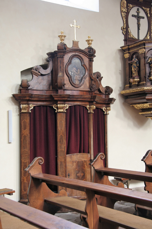 Zu einer Wallfahrt und zur Gewinnung von Ablässen gehört oft auch der Empfang des Bußsakramentes. Unsere barocke Wallfahrtskirche verfügt deshalb über zwei Beichtstühle im Kirchenschiff und einen weiteren in der Sakristei.