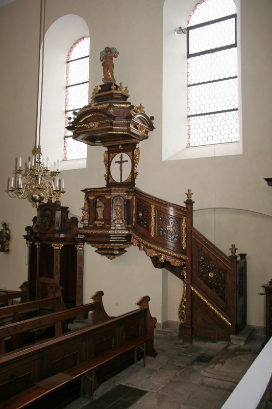 Die um 1720 in der Pfalz entstandene Kanzel gilt als das künstlerisch wertvollste Ausstattungsstück des 18. Jh. Der Kanzelkorb zeigt in Lindenholz geschnitzte Figuren der vier Evangelisten mit den vier Tieren aus der geheimen Offenbarung des Johannes, die ihnen als Attribute beigestellt werden.