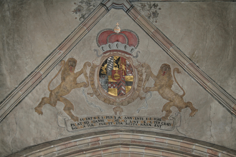 Hier erkennt man noch einmal das schöne sechsteilige Gewölbe des frühgotischen Chortrapezes. Diese Gewölbeform ist durch den Limburger Dom beeinflusst, der wiederum seinem Vorbild in Tournai folgt. In ein Gewölbefeld wurde 1745 das Wappen des Kurfürsten Jan Willem von Pfalz-Neuburg gemalt. Der darunter stehende Text lautet: FaVentIbVs sVperIs aC annVente eLeCtore PaLatIno Ioanne WILheLMo sInt IIs IVgIter grates basILICa haeC perVetVsta restaVrata est. (Durch göttliche Gnadengaben und Zulassung durch den Kurfürsten von der Pfalz Johannes Wilhelm – Dank sei Ihnen – ist diese altehrwürdige Basilika erneuert worden.)