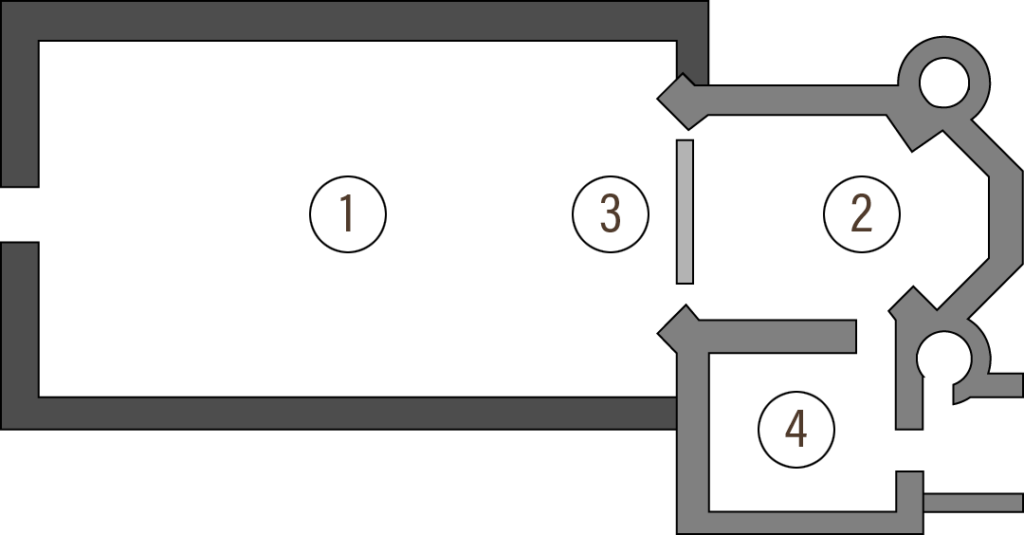 - Rechts unterhalb des Chorraumes die Sakristei mit dem darüberliegenden Oratorium